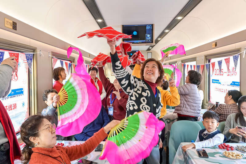 游客将在旅途中迎来2026年新年曙光。哈尔滨局集团公司组建了演艺团队,游客可换“东北花袄”,也可体验剪纸技艺。